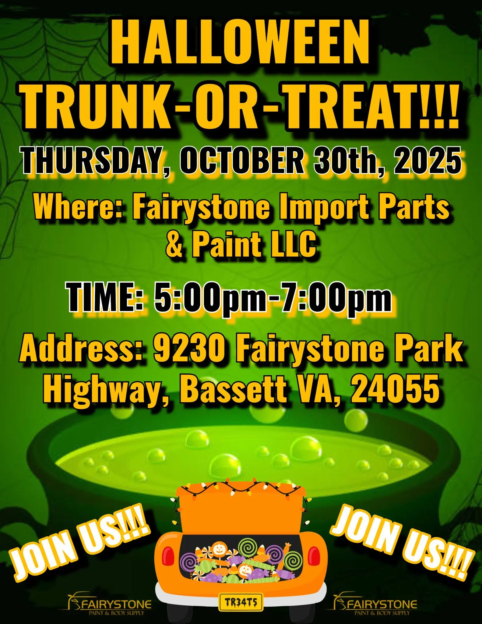 Come out Thursday, October 30th, 2025 for our annual Trunk-or-Treat event! Hosted by us and happening here at Fairystone Import! With themes like Mario, Toy Story, Scooby Doo and more its gonna be a SPOOKTACULAR time!