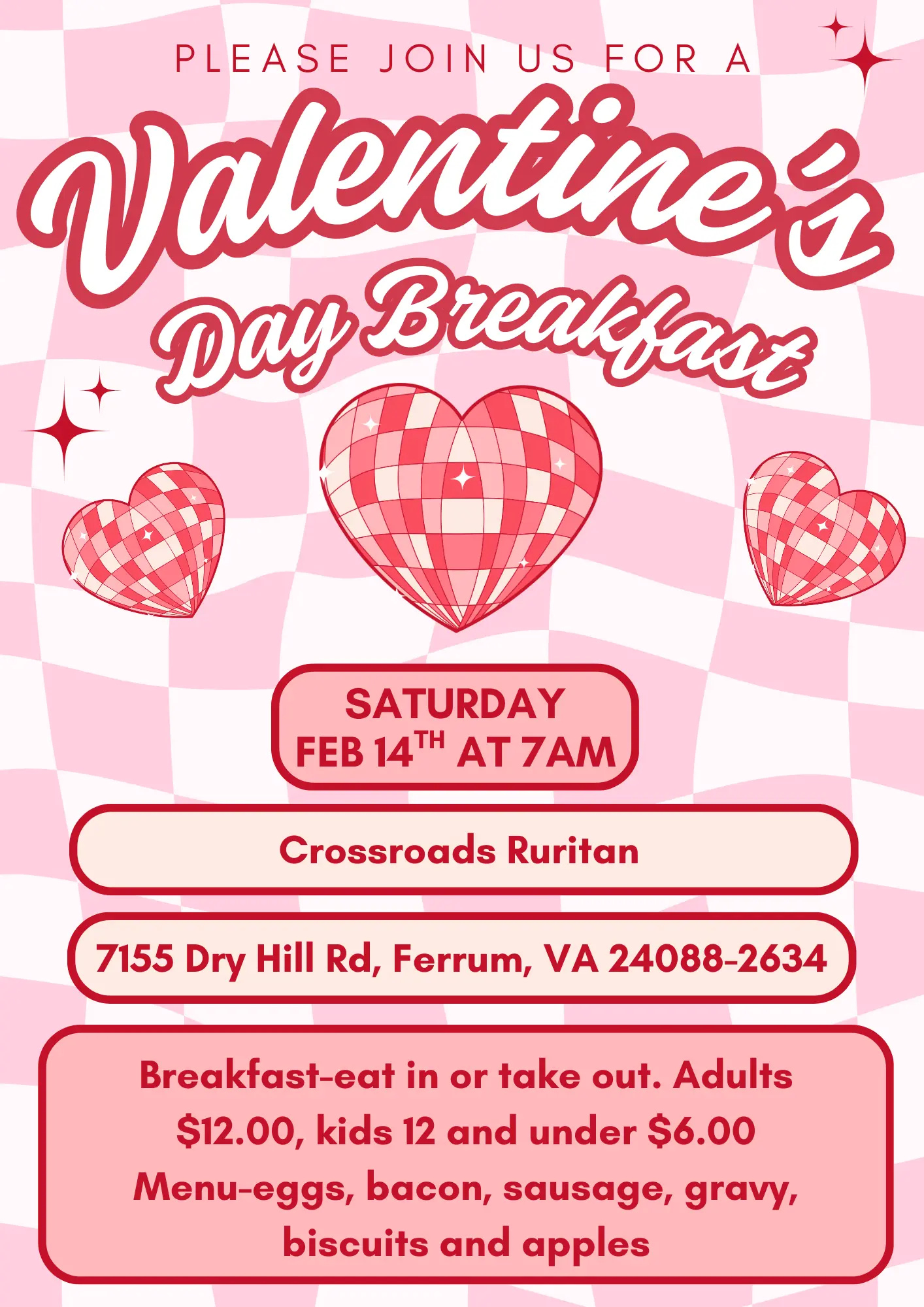 Breakfast-eat in or take out. Adults $12.00, kids 12 and under $6.00