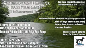 Find out more »Pounds for Hounds Bass Tournament Grab your fishing buddy and join us on Saturday, October 25, 2025 at Philpott Lake – Twin Ridge Boat Ramp for a fun day on the water, all while helping shelter pets in need! $1,000 Guaranteed Payout Entry Fee: $100 per boat (one or two-person teams) Tournament runs 7 AM – 3 PM (Food & drinks will be served at 3 PM!) Location: Philpott Lake, Twin Ridge Boat Ramp All proceeds benefit the Henry County…
