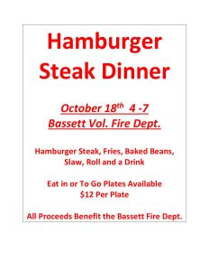 Find out more »October 18th 4 -7 Bassett Vol. Fire Dept. Hamburger Steak, Fries, Baked Beans, Slaw, Roll and a Drink Eat in or To Go Plates Available $12 Per Plate All Proceeds Benefit the Bassett Fire Dept.