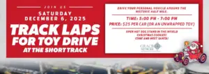 Find out more »TRACK LAPS FOR TOY DRIVE AT THE SHORT TRACK The 31st annual Toy Drive for Track Laps at Martinsville Speedway will be happening on December 6th from 5:00 pm – 7:00 pm. Bring a donation of $25 or a new, unwrapped toy in exchange for a drive around the historic half mile in your personal vehicle! The Hot Dog Stand will be open in the infield, serving the world-famous Martinsville Hot Dogs and Christmas cookies. Bring the whole family out…