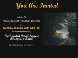Find out more »The Crooked Road Singers and Bluegrass Band will be performing at Rocky Mount Christian Church (120 South Main Street) on Sunday afternoon, January 25, 2026 at 3 PM. The event is free. We are very excited about our upcoming concert and hope the community will join us for this event. Please feel free to share this information and invite your friends and family. We look forward to seeing you there. Facebook