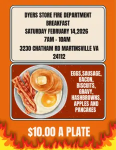 Find out more »Breakfast with a Purpose! Join us for at the Dyers Store Fire Department Country Breakfast and start your Saturday with a hot, hearty meal while supporting your local volunteer firefighters! Saturday, February 14, 2026 7:00 AM – 10:00 AM 3230 Chatham Rd, Martinsville, VA 24112 On the menu:Eggs, sausage, bacon, biscuits & gravy, hashbrowns, apples, and pancakes $10.00 a plateEvery plate sold helps support our department with equipment, training, and resources needed to serve and protect our community. Come hungry, bring a friend, and help us…