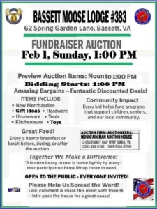 Find out more »Sunday Feb 1, at 1:00PM 62 Spring Garden Lane, Bassett, VA. Preview Auction items: Noon to 1:00PM Bidding Starts: 1:00PM Enjoy a hearty breakfast or lunch before, during or after the auction. Every bid helps fund programs that support children, seniors, and our local community. Together we make a difference! “A burden heavy to one is borne lightly to many.” Your participation helps lift up those in need. This Event is open to the public – everyone is invited! Please…