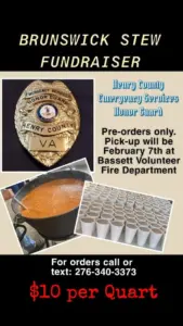 Find out more »Pre-orders only. Pick up will be February 7th at the Bassett Volunteer Fire Department. For orders call or text: 276-340-3373 $10 per quart Henry County Emergency Services Honor Guard – Facebook