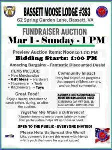Find out more »Bassett Moose Lodge #383 Public Benefit Auction Sunday, March. 1, 2026 62 Spring Garden Lane, Bassett, VA Preview: Noon | Auction: 1 PM Great bargains from Dean Huff & Billy Morris Breakfast & lunch available Every bid supports kids, seniors & our local community Auctioneers: Billy Morris (#4554) & Mike Hutchens (#2709) Mountain Man Auction House (#1009) Like, Comment & Share — help us pack the house for a great cause! Bassett Moose Lodge #383 Public Benefit Auction | Facebook