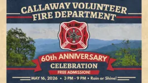 Find out more »Join us as we celebrate 60 years of service to the Callaway community! The Callaway Volunteer Fire Department is hosting a family-friendly evening of live bluegrass music, food trucks, and community fun as we mark our 60th Anniversary. Saturday, May 16, 2026 3PM – 9PM Rain or shine! Callaway Volunteer Fire Department Free admission – open to the public Food trucks Live Music Lineup 3 PM – The Guard 5 PM – Larry Sigmon & the Virginia Girls 7 PM – Twin Creeks Stringband Bring your…