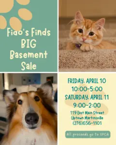 Find out more »The wait is over! Mark your calendars for Friday, April 10 10:00-5:00 and Saturday, April 11 9:00-2:00 – for the first Fido’s BIG BASEMENT SALE of 2026, and it’s going to be massive! Thousands of items at rock bottom prices. Deals so good you’ll say, “Well… I guess I DO need this!” Best of all, every purchase helps animals in need, with all proceeds benefiting the SPCA of Martinsville and Henry County. Come shop big, save big and help pets in…