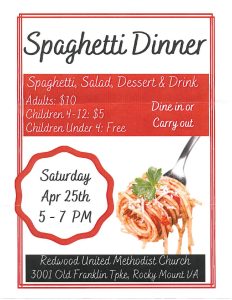 Find out more »Spaghetti, Salad, Dessert & Drink Adults: $10 Children 4-12: $5 Children Under 4: Free Dine in or carry out Saturday Apr 25th, 5 – 7 PM Redwood united Methodist Church 3001 Old Franklin Tpke, Rocky Mount VA