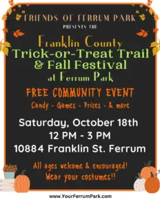 Franklin County Trick-or-Treat Trail & Fall Festival at Ferrum Park! Bring the whole family out for a FREE community event full of candy, games, prizes, and fall fun! Saturday, October 18th 12 PM – 3 PM 10884 Franklin St., Ferrum All ages welcome!(If you’re in costume, you get candy!!) Over 700 people joined us last year—don’t miss this Ferrum tradition! Businesses & community groups will be set up along the trail, handing out treats and prizes. Hosted by Friends of Ferrum Park Franklin County…