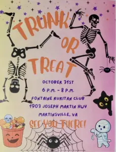 Come out and show us your costumes for our annual Trunk or Treat! October 31st 6 p.m. – 8 p.m. Fontaine Ruritan Club 1903 Joseph Martin Hwy Martinsville, VA. See you there! Fontaine Ruritan’s Trunk or Treat | Facebook
