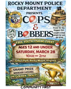 There may be snow on the ground, but SPRING is right around the corner! That means it’s time to mark your calendars for one of our favorite events of the year! COPS & BOBBERS – Youth Fishing Event (Ages 12 and Under) Saturday, March 28 10:00 AM – 2:00 PM Gilly’s Park | 790 Trail Dr, Rocky Mount, VA 24151 Come enjoy a fun day of fishing, laughs, and hanging out with your local officers. It may only be winter now—but we’re already thinking…