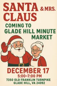 Bring the Family for FREE Pictures with Santa! Santa and Mrs. Claus are making a special stop at Glade Hill Minute Market, and they can’t wait to meet YOU! Enjoy FREE photos with Santa, the perfect way to capture magical Christmas memories with the whole family! Festive fun, warm smiles, and holiday cheer for all ages. December 17th 5:00–7:00 PM 7350 Old Franklin Turnpike, Glade Hill, VA 24092 No cost, no tickets, just come and enjoy a FREE holiday tradition! We can’t…