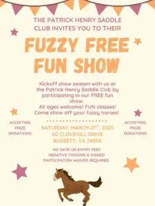 Kickoff show season with us at the Patrick Henry Saddle Club by participating in our FREE fun show. All ages welcome! FUN classes! Come show off your fuzzy horses!To make this a success, we will need member volunteers and prize donations, let us know how you would like to help! Fuzzy FREE Fun Show Kickoff | Facebook