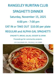 Saturday, November 15, 2025 4:00pm – 7:00pm EAT IN or TAKE OUT $10.00 per plate REGULAR and ALPHA GAL SPAGHETTI SPAGHETTI, BREAD, SALAD, DESSERT & DRINK Proceed go for community projects. 134 CALLOWAY DR, FIELDALE, VA 24089 Rangeley Ruritan Club Spaghetti Dinner – Facebook