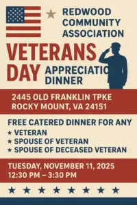 Free Veterans Dinner hosted by the Redwood Community Association. We invite all veterans and their families to join us for an evening of good food, fellowship, and gratitude for their service. Tuesday, November 11, 2025 12:30 PM – 3:30 PM 2445 Old Franklin Turnpike Rocky Mount, VA 24151