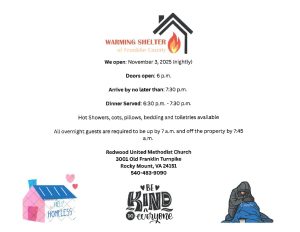 Opens: November 3, (Nightly) Doors open 6 p.m. Arrive by no later than 7:30 p.m. Dinner Served 6:30 p.m. – 7:30 p.m. Hot Showers, cots, pillows, bedding and toiletries available All overnight guests are required to be up by 7 a.m. and off the property by 7:45 a.m. Redwood United Methodist Church 3001 Old Franklin Turnpike Rocky Mount, VA 24151 540-483-9090