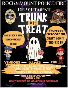 Rocky Mount Police & Fire Departments Annual Trunk or Treat Join the Rocky Mount Police Department and the Rocky Mount Fire Department for our annual Trunk or Treat! This family-friendly event is a safe and fun way to celebrate Halloween with the community.  Date: Thursday, October 30, 2025 Time: 6:00 PM – 8:30 PM Location: 1250 North Main Street, Rocky Mount, VA 24151(Rocky Mount Police & Fire Department Building) Bring the kids in their best costumes to enjoy decorated trunks, tables, candy,…