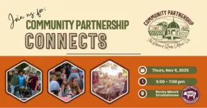 It’s almost time for our next Community Partnership Connects! Join us next Thursday, November 6th from 5–7 PM at Rocky Mount Smokehouse for an evening of community, connection, and good conversation (and yes — delicious BBQ!). These monthly meet-ups are your chance to: Enjoy great food and local flavor Meet new people & reconnect with familiar faces Share ideas, stories, and what’s happening around town Whether you’re a business owner, resident, or just love being part of the Rocky Mount community — you’re…