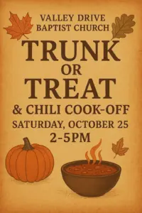 You’re Invited! Join us at Valley Drive Baptist Church for our Trunk or Treat & Annual Chili Cook-Off on Saturday, October 25th, from 2–5 PM.Bring the kids for safe trick-or-treating, enjoy a variety of delicious chili recipes, and cast your vote for this year’s Chili Champion! Fun, food, and fellowship for the whole family—don’t miss it! Trunk or Treat & Chili Cook-off | Facebook